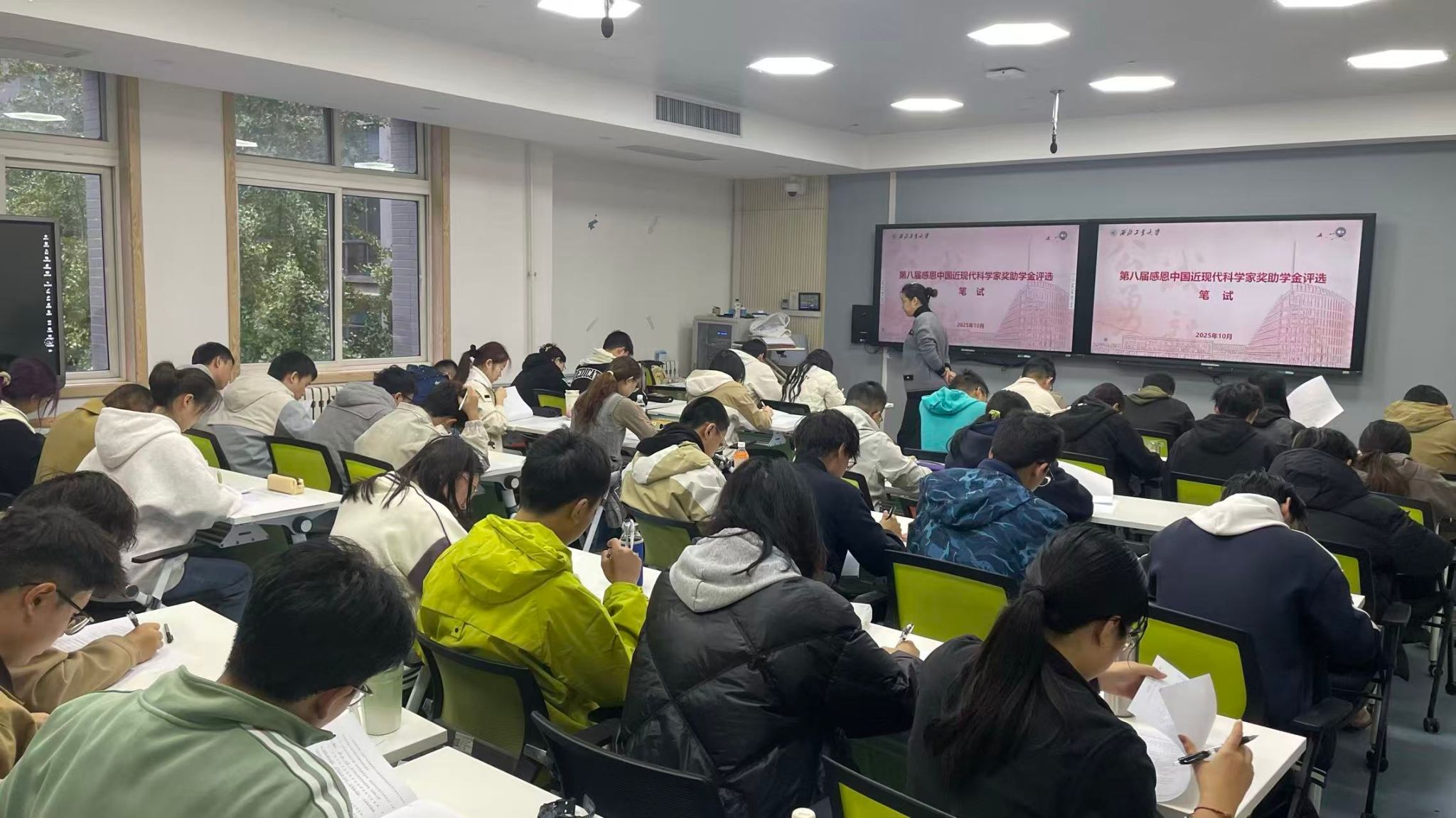 依据设奖单位的评审程序要求,学校于10月20日组织笔试,全校各培养单位初评推荐的49名奖助学金候选人参加了笔试。笔试主要围绕中国近现代科学家的相关事迹和研究成果、我校校情校史和著名科学家校友事迹等进行考察。