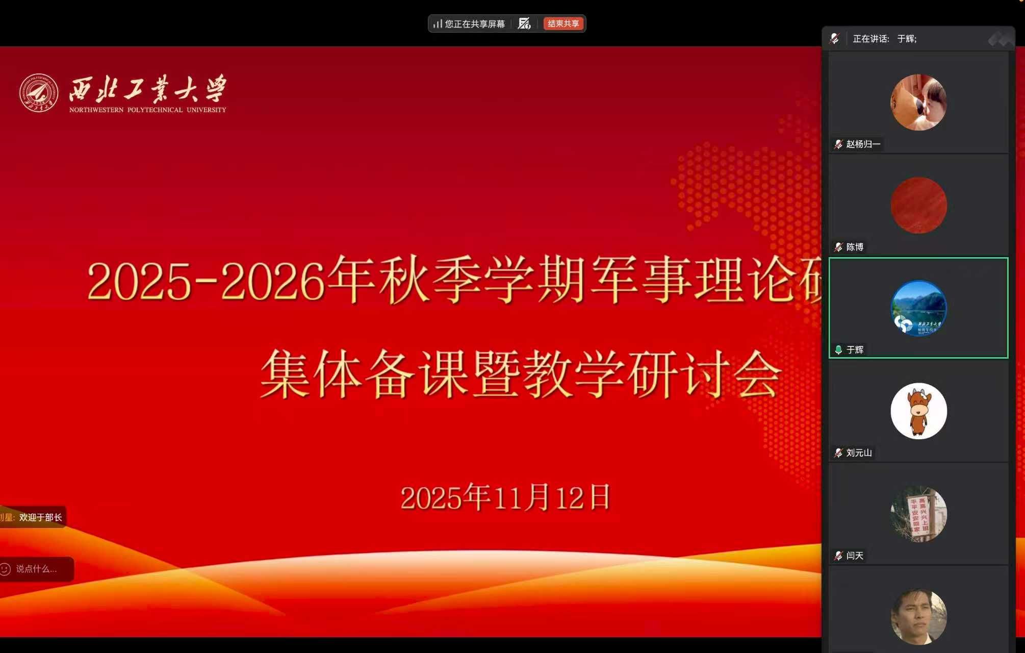 于辉部长首先感谢各位师生对我校国防教育和军事课程建设工作的支持。他希望军事课程在帮助学生理解掌握国防军事发展的同时,积极培养学生系统性、战略性思维。任课教师在备课过程中要充分发挥西工大“三航”学科优势,融入“总师育人文化”,讲好西工大故事,把家国情怀、科研精神与国防传统融入课堂,引导学生关心国防、献身国防。课程要注重体系化与品牌化建设,持续教学质量跟踪反馈并优化考核激励机制,积极引入现代化教学手段,使课程既具有思想高度,又富有时代特色。新军事革命专题庆晓勇、国防法规专题易万军、古军事思想专题杨继钢、新聘教师代表张倩、教学秘书赵杨归一等同志围绕实践教学改革、备课教学设计、课堂师生互动、助教跟课学习、学生意见反馈等方面进行了交流发言。全体老师积极参与教学研讨,结合上半学期的教学情况与学生反馈交流发言,提出强化情境教学、丰富案例展示、提升学生参与度、优化过程性评价等改进举措。杨萌对下半学期重点工作进行部署,强调要推进集体备课常态化、潜心研究军事前沿问题、及时更新教学内容、设计课堂师生互动、规范实践教学考核等事项,并以“高阶性、创新性、挑战度”为导向完成期末考试命题工作。
