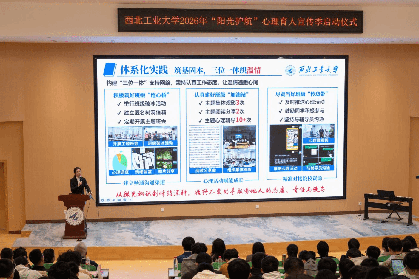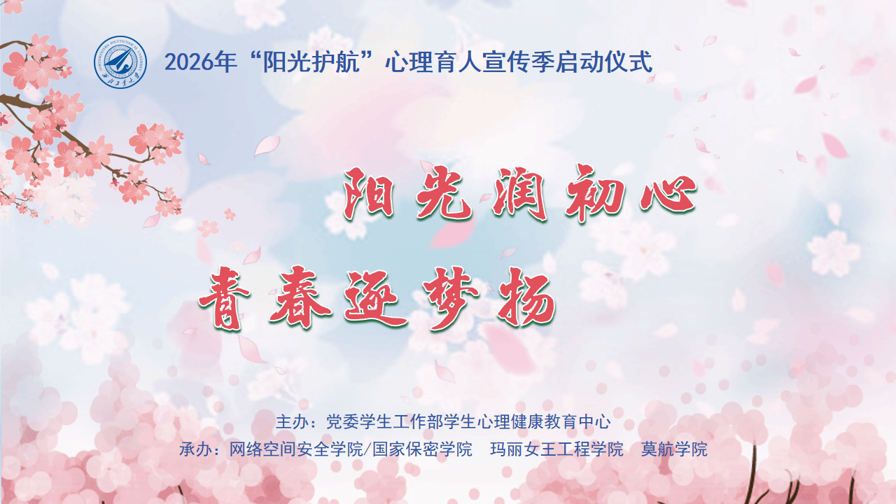 又是一年春光好,扬帆逐梦正当时。3月26日下午,我校2026年“阳光护航”心理育人宣传季启动仪式在长安校区教学西楼A100报告厅举行。本次活动由党委学生工作部学生心理健康教育中心主办,网络空间安全学院/国家保密学院、玛丽女王工程学院及莫航学院联合承办。