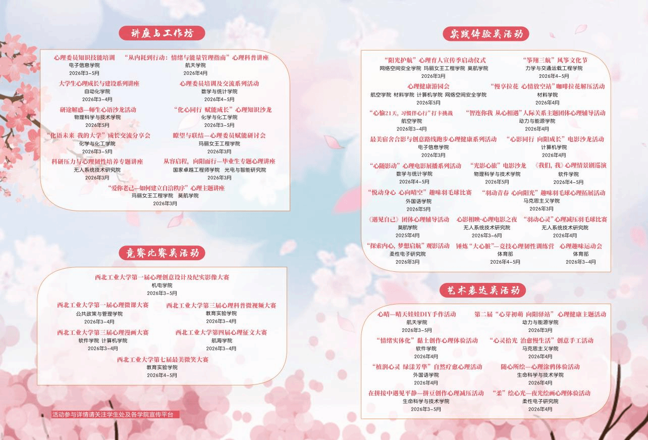 “阳光护航”心理育人宣传季是我校贯彻落实教育部及陕西省新时代学生心理健康教育工作相关要求的重要品牌系列活动,已连续举办多届,逐步形成“校级品牌活动引领、院级特色活动支撑”的两级活动体系。本年度宣传季以“阳光润初心 青春逐梦扬”为主题,围绕讲座与工作坊、竞赛比赛、实践体验和艺术表达四大板块,通过开展形式多样的心理健康教育活动,普及心理健康知识、提升心理调适能力、营造温暖包容的校园心理氛围,为青年学子健康成长保驾护航。