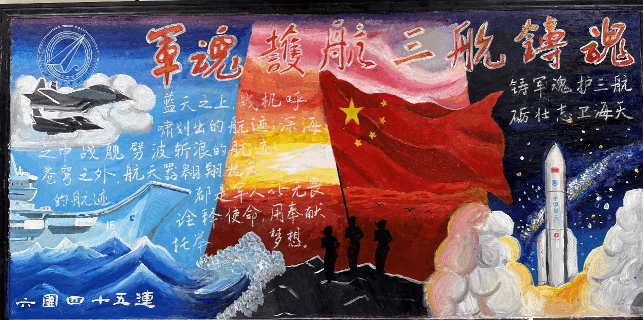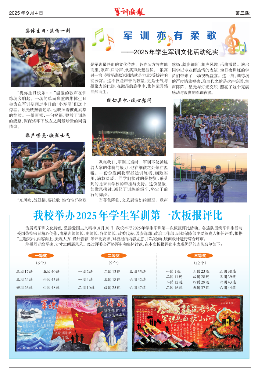 03版: 军训亦有柔歌——2025年学生军训文化活动纪实 集体生日·温情一刻 “祝你生日快乐……”温暖的歌声在训练场旁响起。一场简单而隆重的集体生日会为在军训期间过生日的“小寿星”们送上惊喜。烛光映照着迷彩,也映照着彼此真挚的笑脸。一份蛋糕,一句祝福,驱散了训练的疲惫,深深烙印下战友之间最珍贵的同窗情谊。 歌声嘹亮·凝聚士气 “东风吹,战鼓擂,要拉歌,谁怕谁!”拉歌是军训最热血的文化传统。各连队方阵席地而坐,歌声、口号声、欢笑声此起彼伏,一浪高过一浪。《强军战歌》《团结就是力量》等旋律响彻云霄。这不仅是声音的较量,更是士气与凝聚力的比拼,在激昂的旋律中,集体荣誉感油然而生。 殷切关怀·暖心慰问 飒爽秋日,军训正当时。军训不仅锤炼着大家的体魄与毅力,也在细微之处倾注温暖。一份份慰问物资抵达训练场,细致实用,满载温暖。同学们接过的是物资,感受到的是来自学校的牵挂与支持。这份温暖,如微风拂过,减轻了训练的艰辛,坚定了前行的脚步。 当暮色降临,文艺展演如约而至。歌声悠扬,舞姿翩跹,相声风趣,乐曲激昂。演出同学以专业而热情的表演,为日夜训练的学员们带来了一场视听盛宴。这一刻,训练场的严肃悄然褪去,取而代之的是欢声笑语、掌声阵阵。星光与灯光交织,照亮了这个充满感动与温度的军训夜晚。 我校举办2025年学生军训第一次板报评比 为展现军训文化特色,弘扬爱国主义精神,8月30日,我校举行2025年学生军训第一次板报评比活动。各连队围绕军训生活与爱国荣校宗旨精心创作,由军训师师长、副师长、各团团长、政委代表,及参谋部、政治工作部、后勤保障部主要负责人担任评委,根据“主题突出、内容向上、美观大方、设计新颖”等评比要求,对板报的内容立意、书写绘画、版面设计进行综合评审。 笔墨丹青绘军魂,方寸之间展风采。经过评委会严格评审和集体讨论,在本次板报评比中表现优异的连队名单如下: 一等奖(6个) 三团17连 三团24连 四团26连 五团40连 六团45连 六团48连 二等奖(9个) 一团2连 一团4连 二团10连 二团13连 三团18连 四团25连 五团35连 六团42连 六团47连 三等奖(12个) 一团1连 二团11连 二团12连 二团16连 三团23连 四团28连 四团29连 五团37连 五团38连 五团39连 六团43连 六团44连
