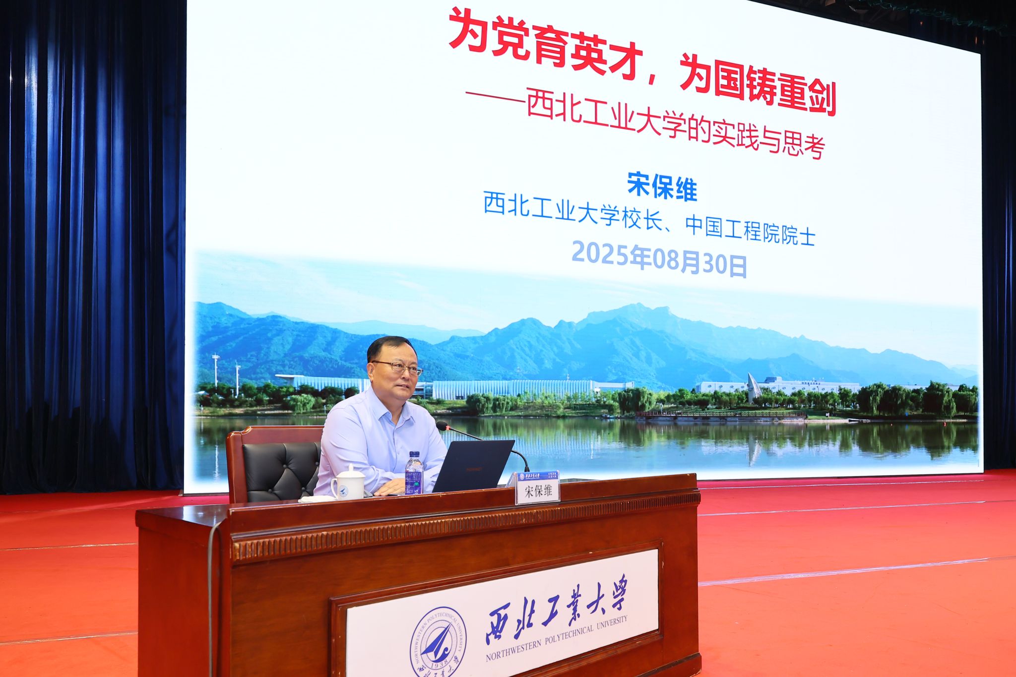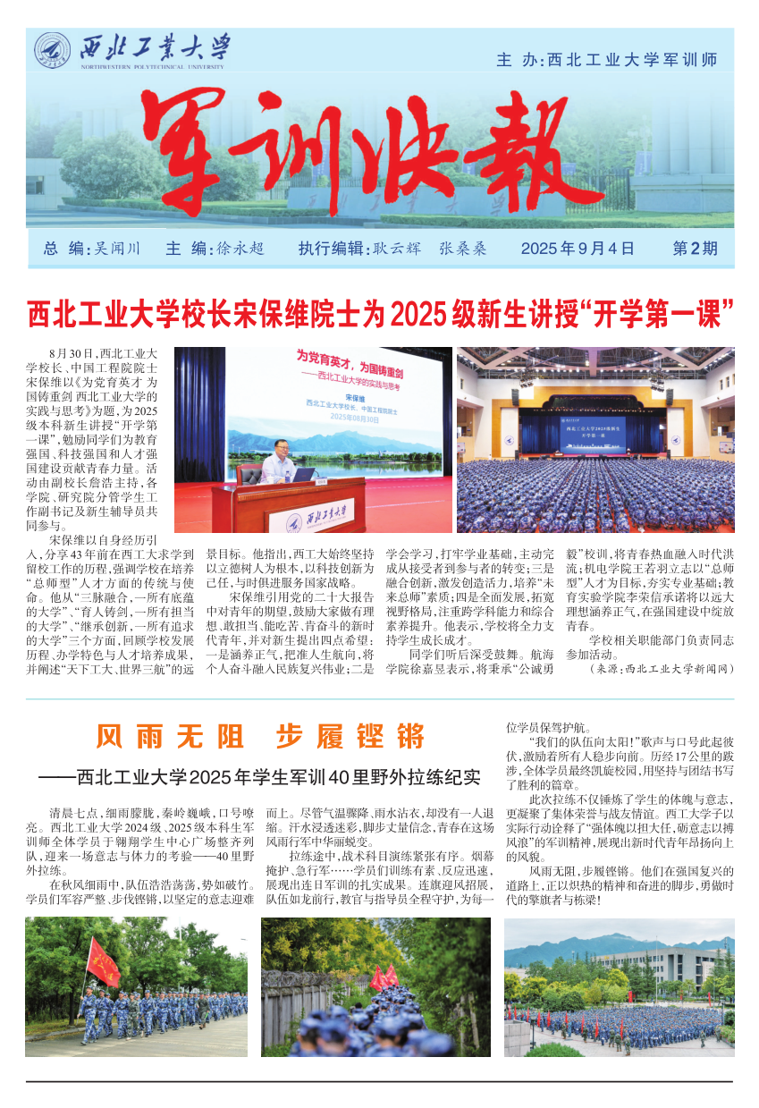01版: 西北工业大学校长宋保维院士为2025级新生讲授“开学第一课” 8月30日,西北工业大学校长、中国工程院院士宋保维以《为党育英才 为国铸重剑 西北工业大学的实践与思考》为题,为2025级本科新生讲授“开学第一课”,勉励同学们为教育强国、科技强国和人才强国建设贡献青春力量。活动由副校长詹浩主持,各学院、研究院分管学生工作副书记及新生辅导员共同参与。 宋保维以自身经历引入,分享43年前在西工大求学到留校工作的历程,强调学校在培养“总师型”人才方面的传统与使命。他从“三脉融合,一所有底蕴的大学”、“育人铸剑,一所有担当的大学”、“继承创新,一所有追求的大学”三个方面,回顾学校发展历程、办学特色与人才培养成果,并阐述“天下工大、世界三航”的远景目标。他指出,西工大始终坚持以立德树人为根本,以科技创新为己任,与时俱进服务国家战略。 宋保维引用党的二十大报告中对青年的期望,鼓励大家做有理想、敢担当、能吃苦、肯奋斗的新时代青年,并对新生提出四点希望:一是涵养正气,把准人生航向,将个人奋斗融入民族复兴伟业;二是学会学习,打牢学业基础,主动完成从接受者到参与者的转变;三是融合创新,激发创造活力,培养“未来总师”素质;四是全面发展,拓宽视野格局,注重跨学科能力和综合素养提升。他表示,学校将全力支持学生成长成才。 同学们听后深受鼓舞。航海学院徐嘉昱表示,将秉承“公诚勇毅”校训,将青春热血融入时代洪流;机电学院王若羽立志以“总师型”人才为目标,夯实专业基础;教育实验学院李荣信承诺将以远大理想涵养正气,在强国建设中绽放青春。 学校相关职能部门负责同志参加活动。 (来源:西北工业大学新闻网) 风雨无阻,步履铿锵 清晨七点,细雨朦胧,秦岭巍峨,口号嘹亮。西北工业大学2024级、2025级本科生军训师全体学员于翱翔学生中心广场整齐列队,迎来一场意志与体力的考验——40里野外拉练。 在秋风细雨中,队伍浩浩荡荡,势如破竹。学员们军容严整、步伐铿锵,以坚定的意志迎难而上。尽管气温骤降、雨水沾衣,却没有一人退缩。汗水浸透迷彩,脚步丈量信念,青春在这场风雨行军中华丽蜕变。 拉练途中,战术科目演练紧张有序。烟幕掩护、急行军……学员们训练有素、反应迅速,展现出连日军训的扎实成果。连旗迎风招展,队伍如龙前行,教官与指导员全程守护,为每一位学员保驾护航。 “我们的队伍向太阳!”歌声与口号此起彼伏,激励着所有人稳步向前。历经17公里的跋涉,全体学员最终凯旋校园,用坚持与团结书写了胜利的篇章。 此次拉练不仅锤炼了学生的体魄与意志,更凝聚了集体荣誉与战友情谊。西工大学子以实际行动诠释了“强体魄以担大任,砺意志以搏风浪”的军训精神,展现出新时代青年昂扬向上的风貌。 风雨无阻,步履铿锵。他们在强国复兴的道路上,正以炽热的精神和奋进的脚步,勇做时代的擎旗者与栋梁!