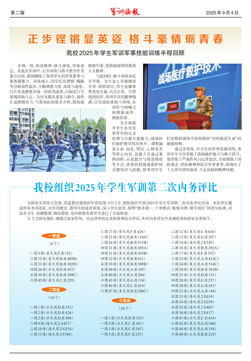02版: 正步铿锵显英姿 格斗豪情砺青春 我校2025年学生军训军事技能训练半程回顾 步调一致,彰显精神;格斗演练,淬炼意志。在此次军训中,正步训练与格斗教学作为重点内容,深刻锤炼了参训学生的军事素养与集体凝聚力。训练场上,同学们从摆臂、踢腿等分解动作起步,不断调整力度、高度与速度,以汗水浇灌整齐划一的队列成果,以响亮口号展现昂扬斗志。历经无数次重复与磨合,最终汇成铿锵有力、气势如虹的整齐方阵,既练就挺拔军姿,更铸就深厚的集体主义精神。 与此同时,格斗训练亦扎实开展。女生连匕首操刚柔并济、招招凌厉,男生连擒拿拳虎虎生威、式式生风。尽管夜间组织,参训学员仍精神饱满,以实战标准投入训练,在动作与呐喊之间磨砺血性、激扬青春。 为全面提升学生在突发事件中的应急处突与自救互救能力,战场医疗救护教学同步展开。课程涵盖止血、包扎、固定、心肺复苏等核心内容,急救人员通过案例剖析、示范教学与情景模拟等方式,系统传授战地救护的关键知识与技能,使参训学生们在模拟演练中深刻体悟“时间就是生命”的救援原则。 通过系统化、全方位的军事技能训练,参训学生不仅掌握了战场救护能力与格斗技巧,更淬炼了正步作风与纪律意识,全面增强了国防观念、团队精神和综合军事素养,展现出了工大青年团结奋进、斗志昂扬的精神风貌。 我校组织2025年学生军训第二次内务评比 为深化军训育人实效,营造整洁规范的军营氛围,9月2日,我校组织开展2025年学生军训第二次内务评比活动。本次评比覆盖所有参训连队,由军训教官、指导员组成评审组,深入学生宿舍,按照“整齐划一、干净整洁、棱角分明、细节到位”的评分标准,对宿舍卫生、床铺整理、物品摆放、室内整体布置环节进行了全面检查。 方寸之间见规矩,细微之处显作风。经过评审组认真检查和综合评议,本次内务评比中表现优秀的寝室名单如下: 一等奖(6个) 一团5连(星天苑F座152) 二团15连(星天苑B座405B) 三团23连(星天苑B座102D) 四团26连(云天苑D座455) 五团39连(星天苑B座309C) 六团45连(星天苑C座229) 二等奖(18个) 一团1连(云天苑D座152) 一团2连(云天苑D座424) 一团2连(云天苑D座504) 二团9连(海天苑2 A427) 二团10连(海天苑2 G218) 二团11连(海天苑2 F346) 三团17连(星天苑F座426) 三团23连(星天苑B座110A) 三团24连(星天苑B座511B) 四团31连(星天苑B座205A) 四团31连(星天苑B座505B) 四团32连(云天苑B座631) 五团39连(星天苑B座309B) 五团40连(云天苑A座105) 五团40连(云天苑A座204) 六团43连(星天苑G座134) 六团46连(星天苑C座414) 六团47连(星天苑B座206C) 三等奖(24个) 一团1连(云天苑D座315) 一团3连(云天苑C座341) 一团3连(云天苑C座347) 一团5连(星天苑F座235) 二团12连(星天苑C座636) 二团13连(星天苑G座207) 二团14连(海天苑2 E520) 二团16连(星天苑B座202A) 三团17连(星天苑F座552) 三团23连(星天苑A座412C) 三团24连(星天苑A座514C) 三团24连(星天苑B座101B) 四团25连(云天苑D座153) 四团28连(星天苑E座237) 四团30连(星天苑G座453) 四团32连(云天苑A座144) 五团33连(海天苑2 E634) 五团34连(海天苑2 G230) 五团35连(海天苑2 E402) 五团38连(海天苑2 E417) 六团41连(云天苑C座434) 六团42连(星天苑G座540) 六团44连(星天苑G座354) 六团48连(云天苑B座218)