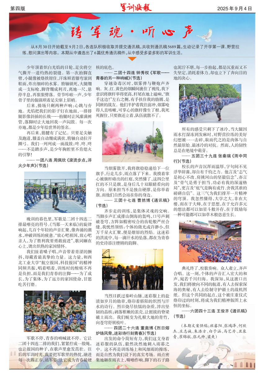 04版: 少年顶着炽白光焰的日轮,足尖将空气撕开一道灼热的裂缝。第一次抬脚直劈,小腿像被烙铁钳住,汗珠顺着膝弯滚到鞋面,炸出细碎的水雾。胯轴锁死,大脚绷成一支标枪,脚背绷成利刃,离地一尺,悬停半息,再狠狠劈落。骨节咔啦一声,少年骨子里的倔强顺着足尖窜上眉梢。 后来,操场只剩两种声响:心跳与夯地。光焰把我们的影子钉在地面,一排排腿影像斜插的长戟——抬腿时让风灌满裤管,落脚时让大地回我一声闷鼓。每一次夯地,都是少年给世界的签名。 再后来,筋腱有了记忆。只要足尖触及跑道,膝盖自动绷成满弦,胯轴自动拉开圈弓。我们一列列成一面战鼓:咚、咚、咚——不是踏步声,是少年胸腔里不肯熄火的引擎! ——一团八连 周佩欣 《滚烫步点,淬火少年声》(节选) 晚训的暮色里,军歌是二团十四连二排最嘹亮的符号。《当那一天来临》的旋律响起,几百个年轻的声音汇聚,像奔涌的潮水,冲破训练的疲惫。“放心吧祖国,放心吧亲人,为了胜利我要勇敢前进”,歌词砸在心上,烫出炽热的家国情怀。 我们扯着嗓子唱,声音带着青涩的颤抖,却藏着最真挚的力量。这力量,和西北工业大学“航空报国,科技报国”的精神同频共振,唱着唱着,训练时的酸痛不再是负担,而是我们青春的注脚——为了成长,为了集体,为了远方的家国使命,甘愿吃苦打磨。 军歌不停,青春的呐喊就不停。它让二团十四连二排的我们,紧紧拧成一股绳,也让报国的种子,在歌声里愈发茁壮。往后的军训时光,我要把军歌里的热忱,融进每一次踢正步,站军姿,让它成为青春最硬核的底色。 ——二团十四连 钟秀权 《军歌——青春的另一种呐喊》(节选) 穿越染毒区时,烟雾弹与鞭炮声齐响。灰、红、黄色的烟瞬间裹住了视线,我下意识将旗杆举得更高,杆尾在地上磕响,“旗手这边!”左右之侧,有手扶住我的胳膊,是同班的战友。他们半护着我往前冲,烟雾呛得人直咳嗽,可掌心的旗杆像生了根,我死死握住,只要旗还立着,队伍就散不了。 当烟雾散开,我将旗稳稳递给下一位旗手,行走几步,雨点落了下来。我摸着掌心被旗杆硌出的红痕,突然懂了,这四公里扛的不只是旗,是身后几十双眼睛看向的方向。原来担当不是独自硬撑,是你举着旗,而他们自然会站在你的身边。 ——三团十七连 曹然博 《通讯稿》(节选) 齐步走的训练,是集体灵魂的交响。当脚步声汇成排山倒海的轰鸣,口号声刺破苍穹,方阵如精密咬合的齿轮般严丝合缝,我恍然领悟:个体的微光或许渺小,但万千星火汇聚,便是燎原的烈焰。这迷彩的洪流中,每一滴汗水的坠落,都在为青春的史诗添注铿锵的韵脚。 当烈日跃过秦岭山脉,迷彩服上的盐渍如岁月的勋章,烙印着骄阳的炽烈与汗水的诗行。烈日烧尽怯懦的杂质,淬出坚韧的晶核;剥落稚嫩的茧壳,让挺拔的脊梁破土而出。我们蜕变为扎根大地的青竹,向苍穹舒展枝叶。 ——四团二十六连 董奥博 《烈日熔炉铸风骨,迷彩诗行刻青春》(节选) 出发的命令简短有力,我们这支身着迷彩服的队伍,毅然决然地刺入雨幕之中。这不再是训练场上和风细雨的操练,而是自然为我们设下的真实考场。雨点密集地砸在雨衣上,噼啪作响,脚下的石子路也泥泞不堪,每一步抬起,都是沉重而又不失坚定,消耗着体力,却也立下了奔向目的地的决心。 所有的感受只剩下了冰冷,当大腿因雨水打湿冻到发麻时,对野营拉练的美好幻想被一一击碎,取而代之的是肉体与自然最原始、最冰冷的对抗。然而,人的韧性总是在绝境中萌芽。 ——五团三十九连 张秦瑞 《雨中同行》(节选) 校长的声音沉浑而温厚,字句间不见浮华辞藻,却自有千钧之力。他言及“志气是初心不改、肩挑河山的坚毅信念”,亦言及“骨气是勇于担当、功必有我的深邃格局”,更言及“底气是胸有成竹、舍我其谁的磅礴自信”。这三气为我们撑开一片精神的穹顶。我忽然懂得,大学之大,非在大楼,而在于大师,在于思想,在于允许多元的想法都可以如星斗般并存,在于鼓励每一种可能都可以如草木般恣意生长。 典礼终了,校歌奏响。众人肃立,齐声合唱。这一刻,个体的声音汇入宏大的和声,宛若千川归海。我深知,从这渡口出发,我们将驶向不同的航道,有人去探索深海的奥秘,有人去绘制守护疆土的战机图纸。但这个共同的起点,这个被庄重仪式烙印过的时刻,将成为我们精神版图上永恒的坐标。 ——六团四十三连 王俊齐 《通讯稿》(节选) 铸军魂·听心声 从8月30日开始截至9月2日,各连队积极收取并提交通讯稿,共收到通讯稿5689篇,生动记录了开学第一课、野营拉练、慰问演出等内容。本期从中遴选出了6篇优秀通讯稿件,从中感受多姿多彩的军训生活。 |